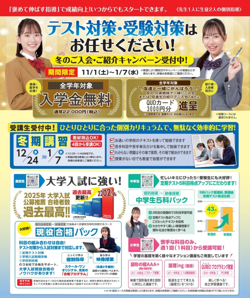 京進の個別指導スクール・ワン広島駅前教室では、11/1~1/7まで『冬のご入会・ご紹介キャンペーン』を絶賛実施中です。友だちと一緒に頑張ってみませんか?友だちと一緒だからこそ無理なく頑張れる!期間中、お得な特典満載です。個別指導塾だから、元気いっぱいの小学1年生から大学受験を控えた高校3年生まで、幅広い学年に対応しています。ぜひこの機会に、スクール・ワンの「褒める指導」を体験してください!